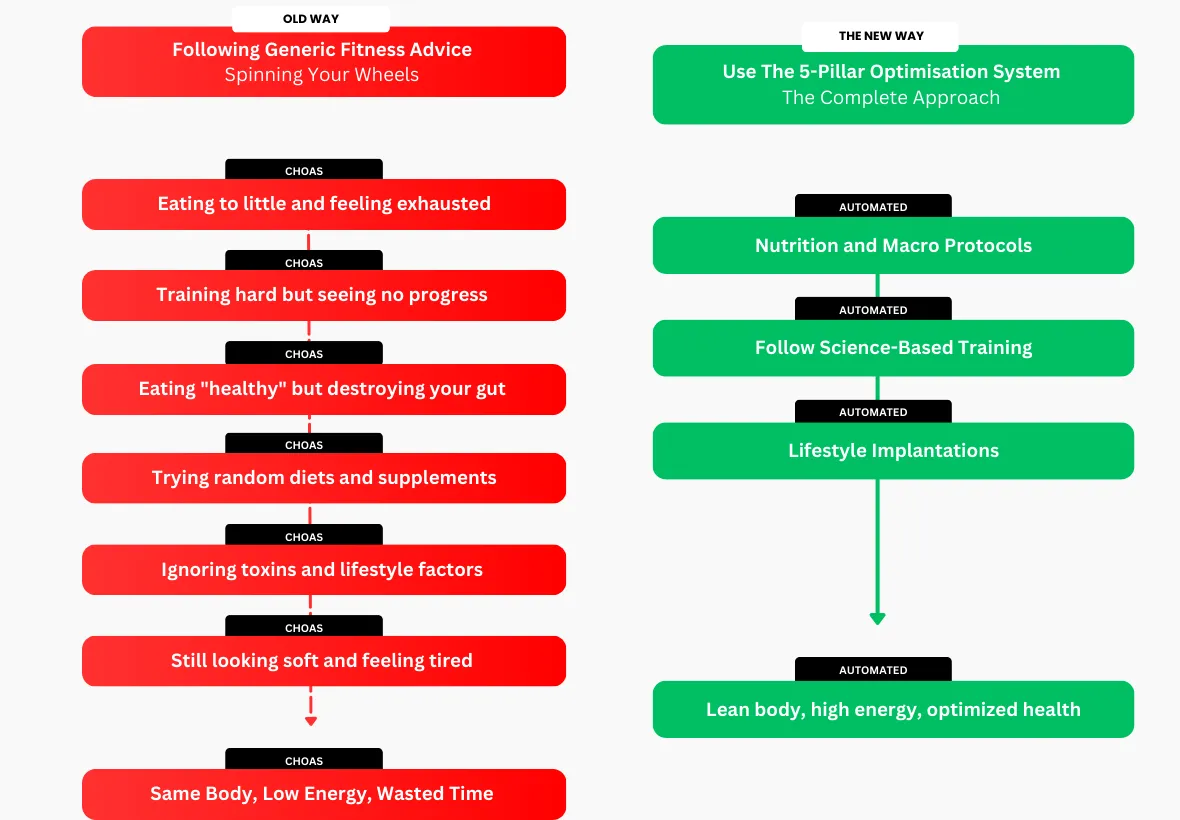 The solution to the common problem of being stuck in fitness mediocrity despite working hard. It's a complete 5-pillar framework that addresses EVERYTHING affecting your transformation — nutrition, macro timing, science-based training, toxin elimination, and lifestyle optimization. Unlike other programs that give you pieces, this gives you the complete picture. We help you build a lean, energized, optimized body by implementing all pillars together, not just one or two.
